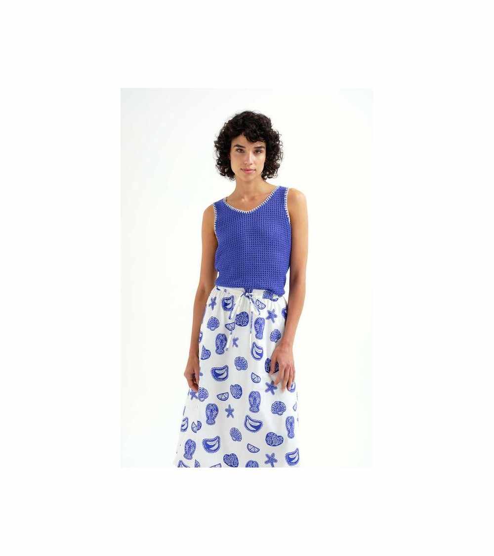 Top azulón con ribete crudo de ganchillo.