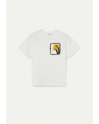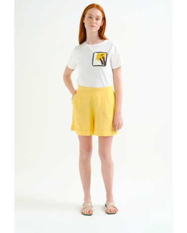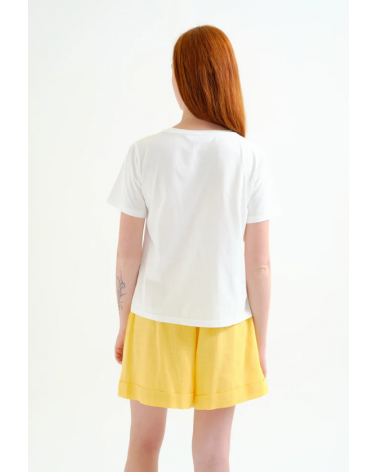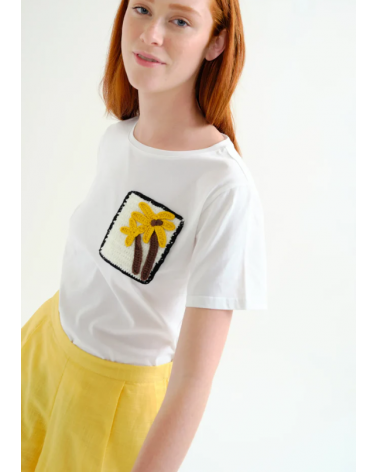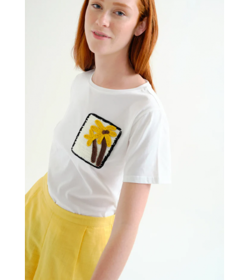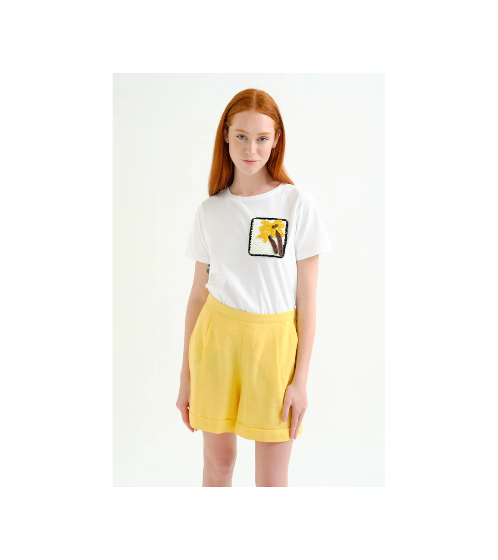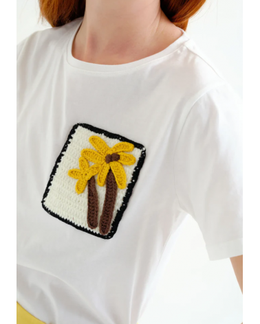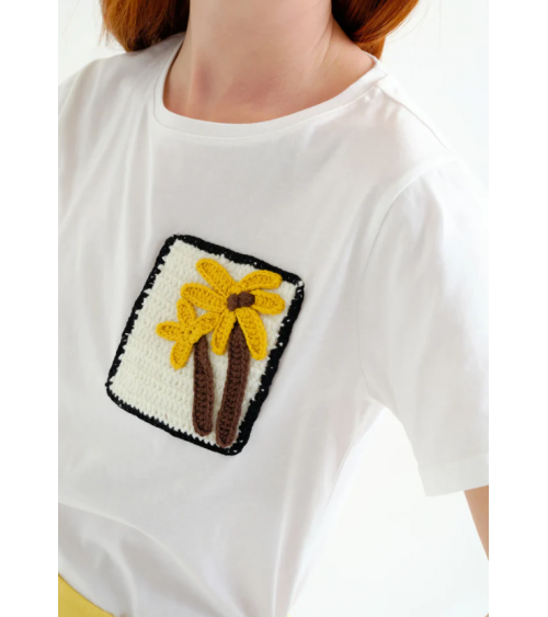 Camiseta blanca de manga corta y cuello redondo. Cuenta con detalle de croché cuadrado a contraste en negro, amarillo y marrón haciendo efecto bolsillo pecho.