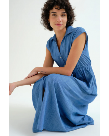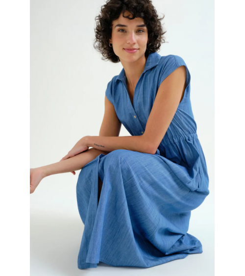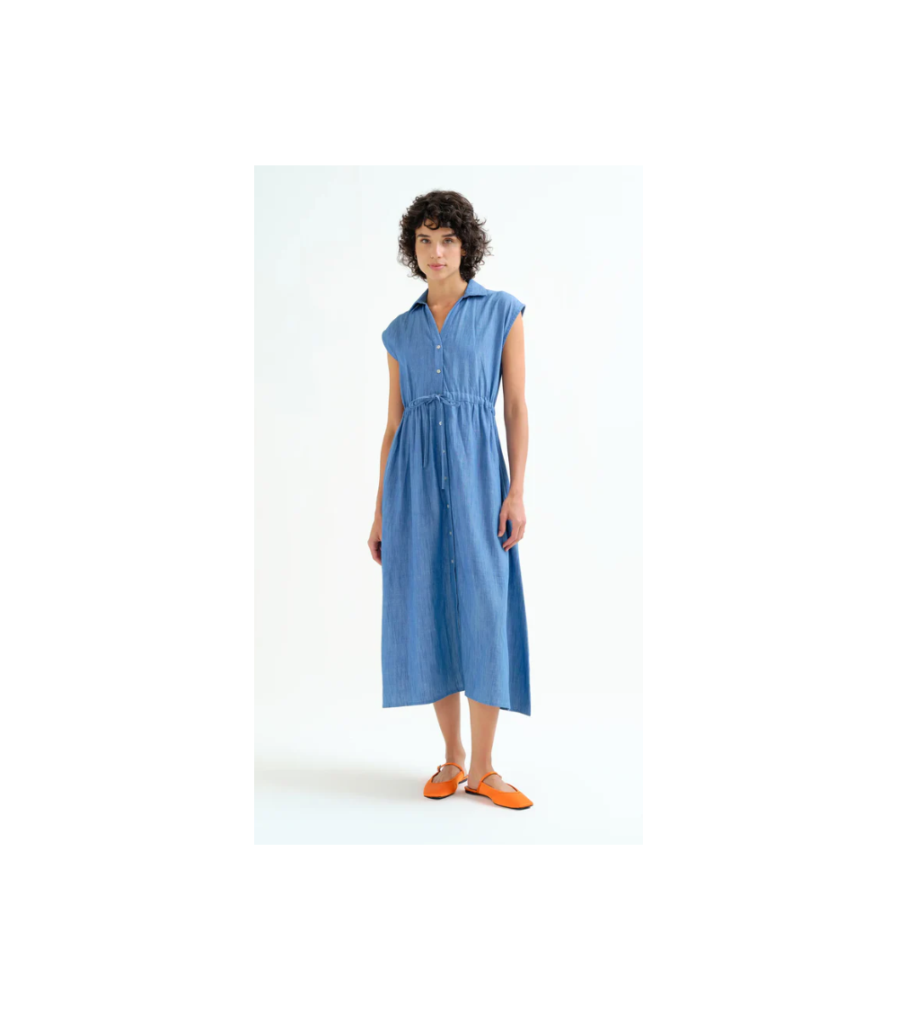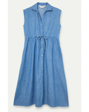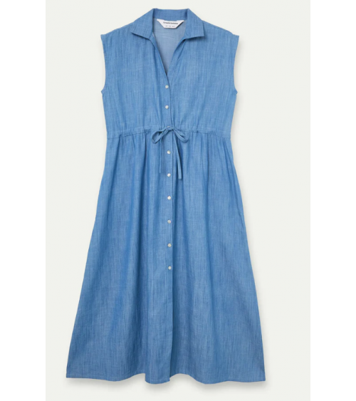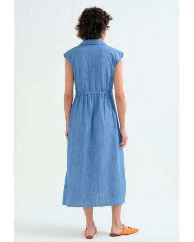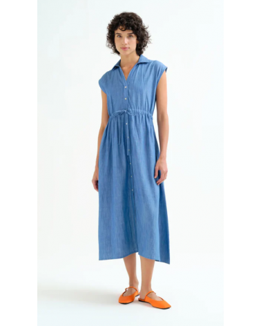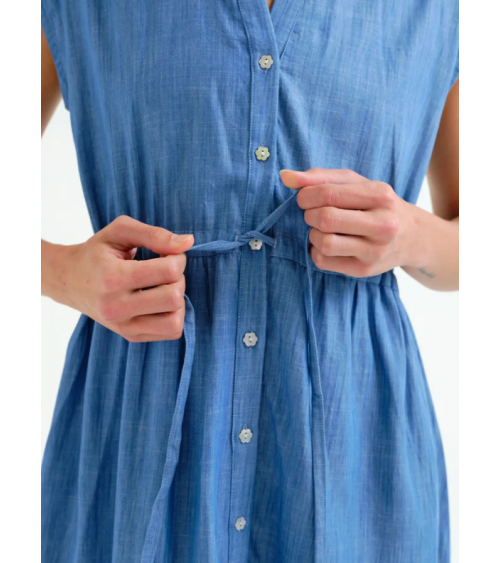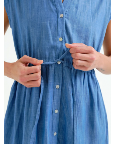 Vestido midi con tejido 100% algodón chambray de color azul claro. Cuello solapa y sin mangas. Cierre frontal con botones en forma de flor de color blanco. Cintura ajustable con cordón. La modelo mide 175 cm y lleva la talla S.