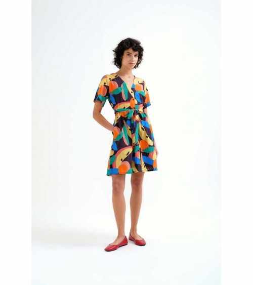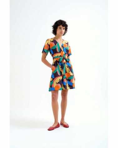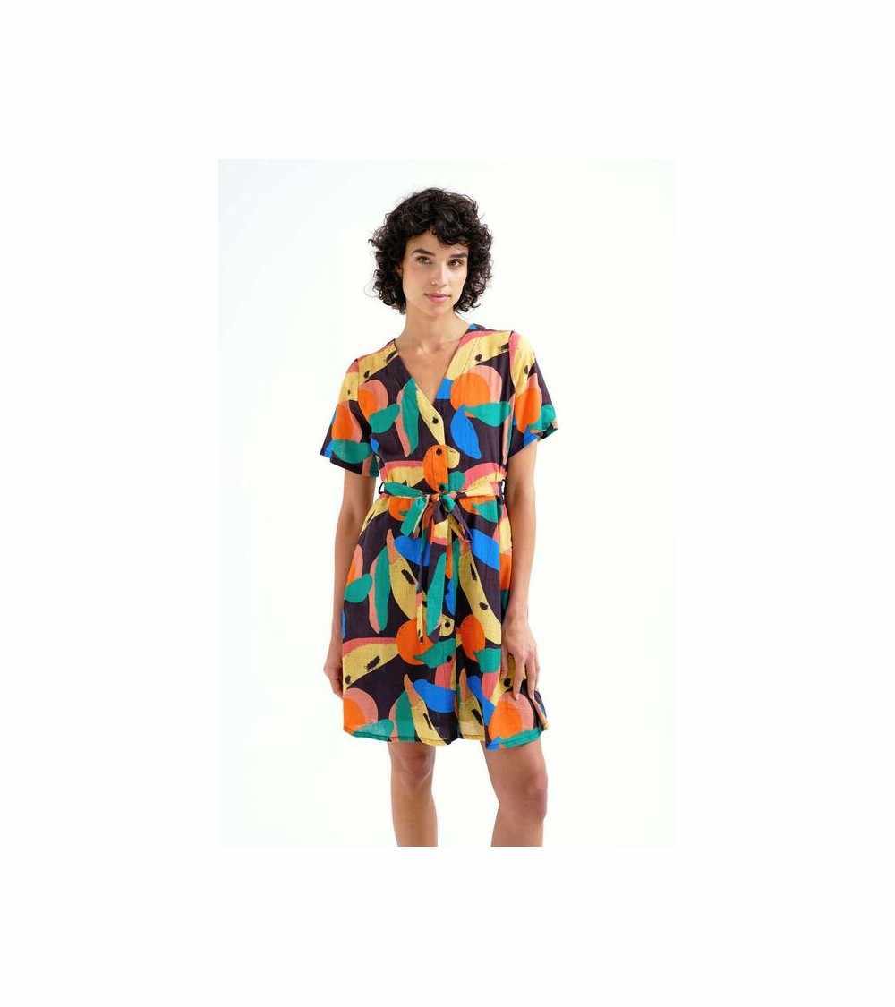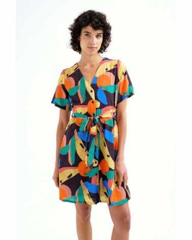 Vestido corto negro estampado multicolor manga corta escote pico COMPAÑÍA FANTÁSTICA