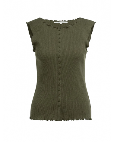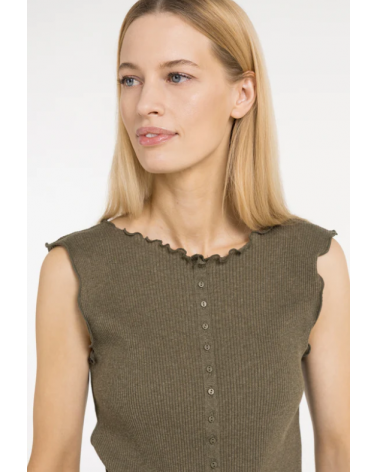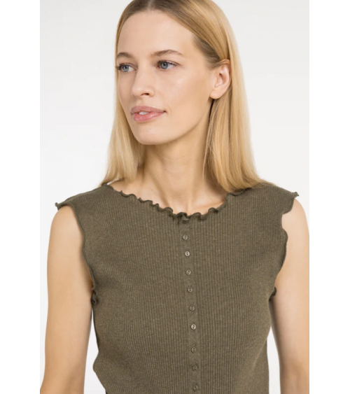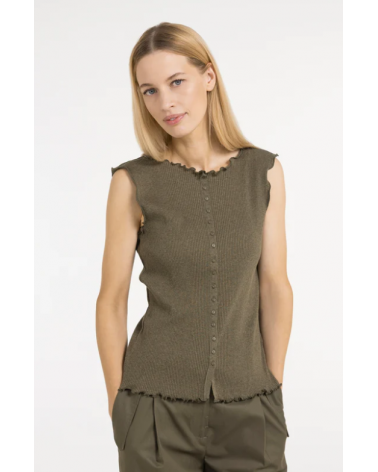 Top sin mangas presenta una silueta ajustada y una fina textura acanalada. El escote redondo y el bajo están rematados con sutiles volantes, que le aportan un toque suave y femenino. Los pequeños botones en la parte delantera le dan un toque refinado.