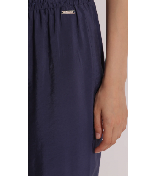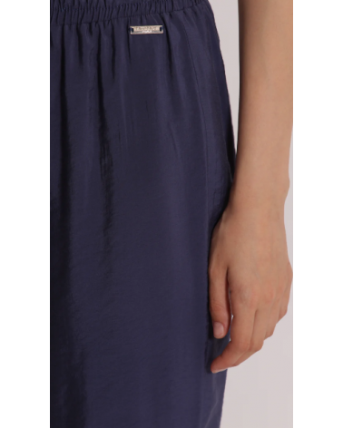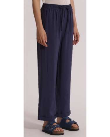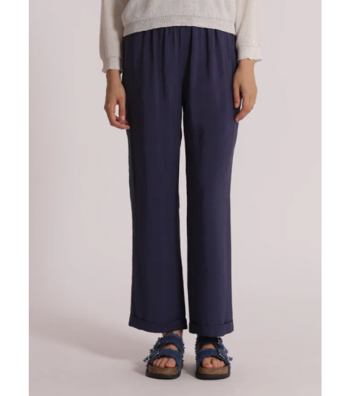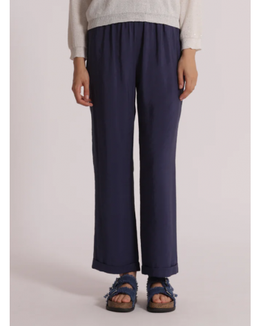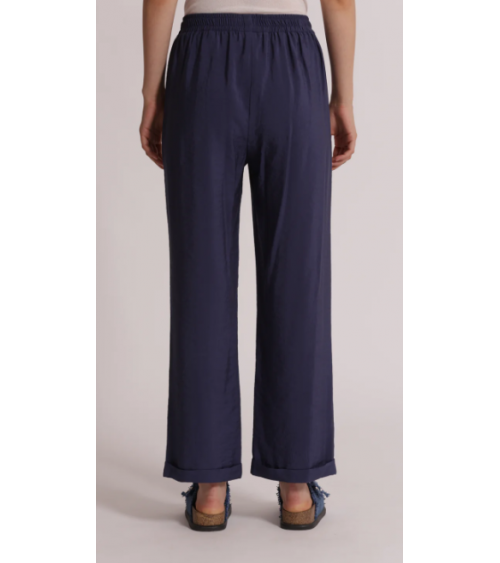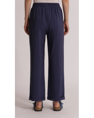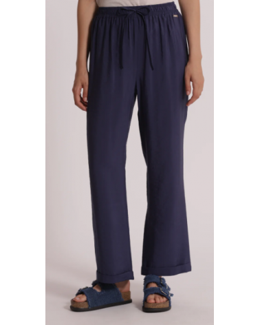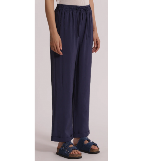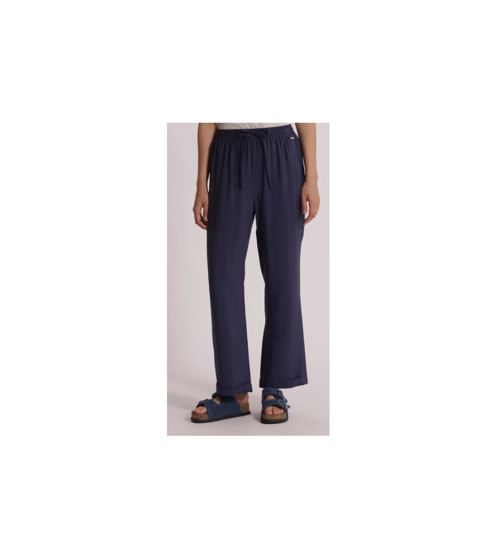 Pantalón azul fluido largo. Cintura elástica con cordón. Pierna recta con bajo vuelta.