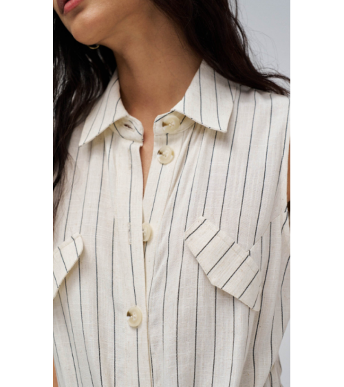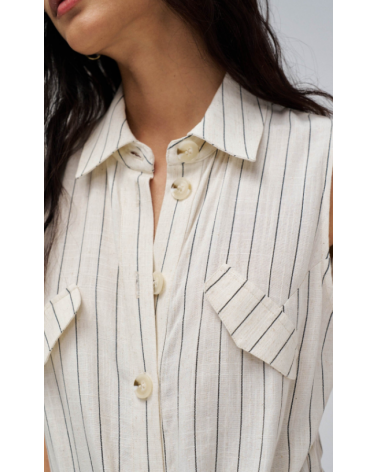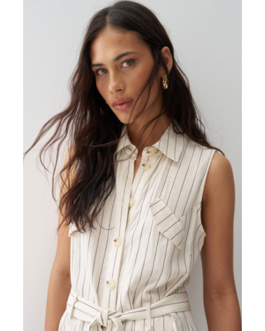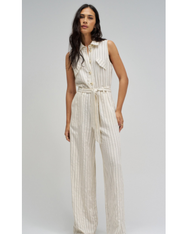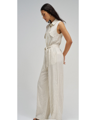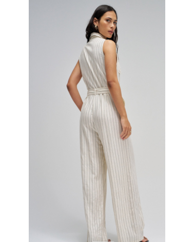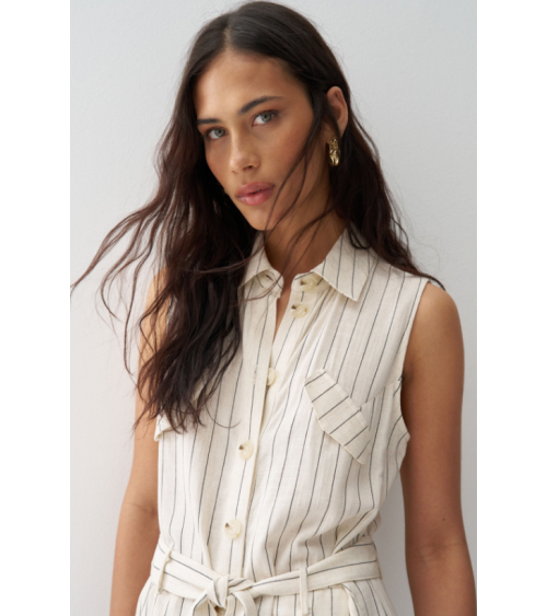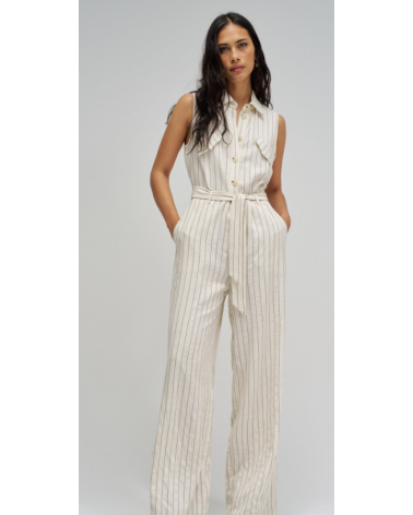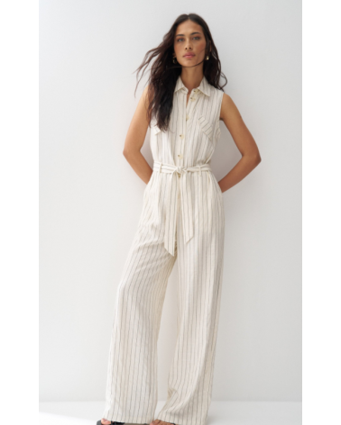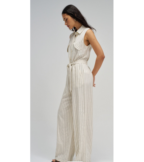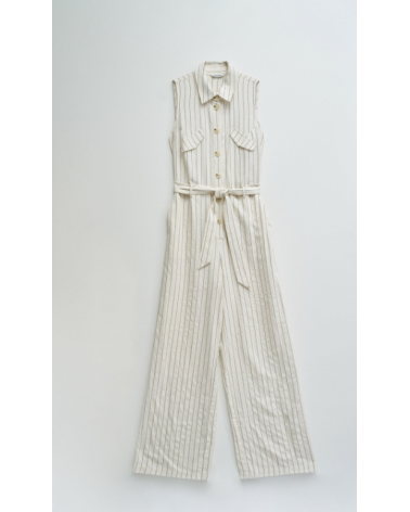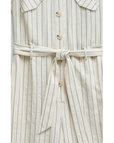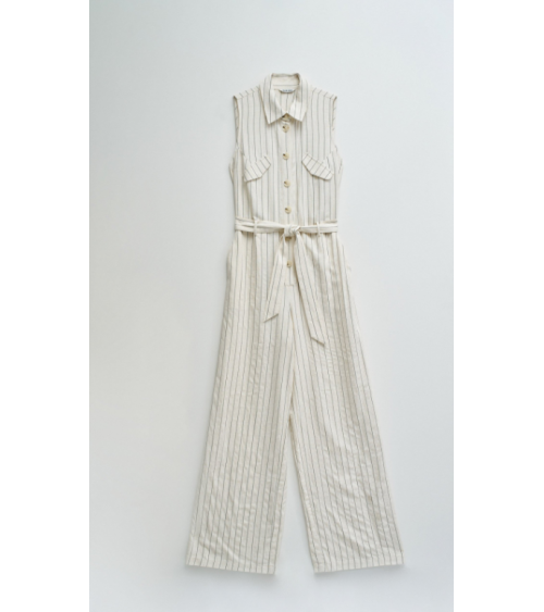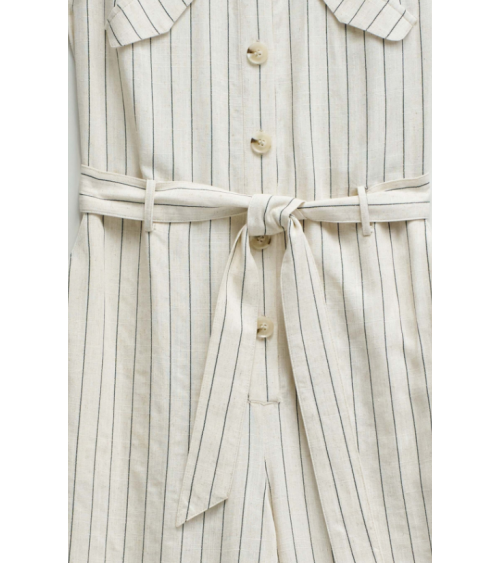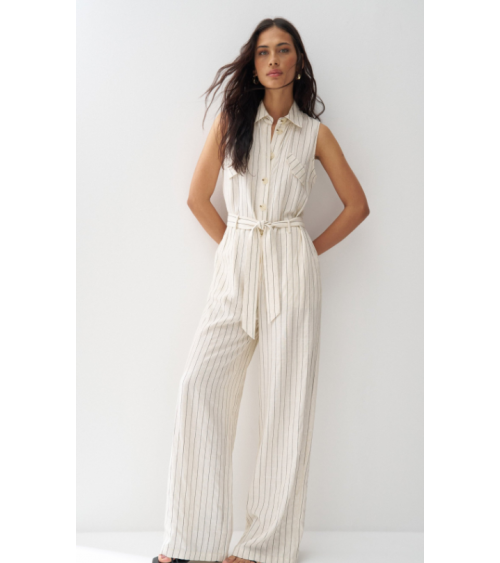 Mono confeccionado con lino en raya diplomática, presenta un fit regular y pierna wide, creando un movimiento natural y elegante. El escote con cuello y la apertura frontal con botones añaden un toque clásico, mientras que las solapas decorativas en el pecho realzan el diseño de la prenda. Las presillas con cinturón removible permiten ajustar la cintura y definir la silueta con comodidad.