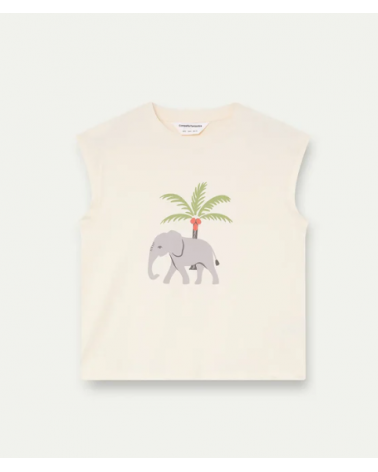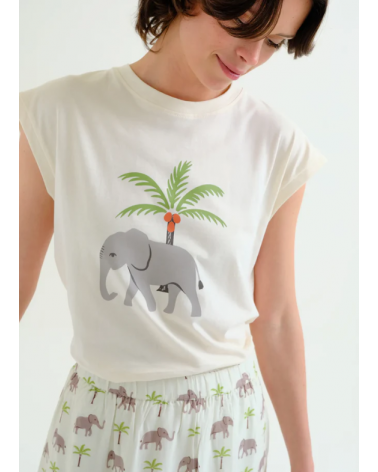 Camiseta de tejido 100% algodón de color amarillo con estampado elefante y palmera. Cuello redondo y manga corta.