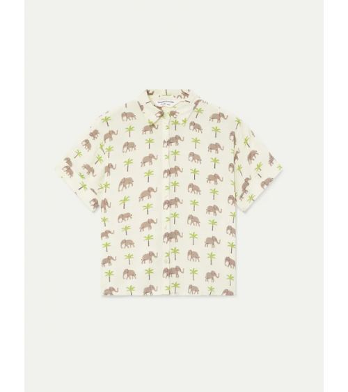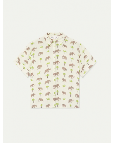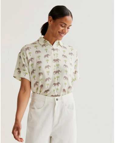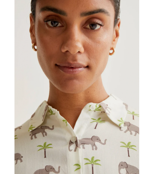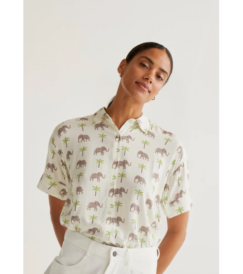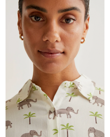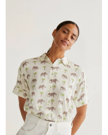 Camisa de tejido rayon lenzing ecovero con estampado de elefantes y palmeras. Cuello solapa y manga corta. Cierre frontal con botones de color blanco.