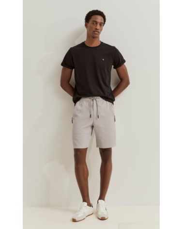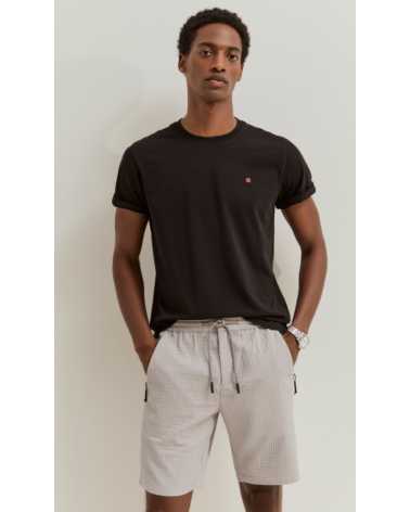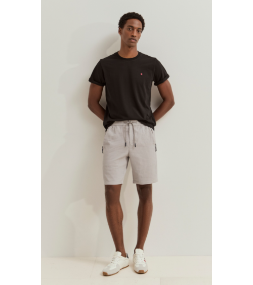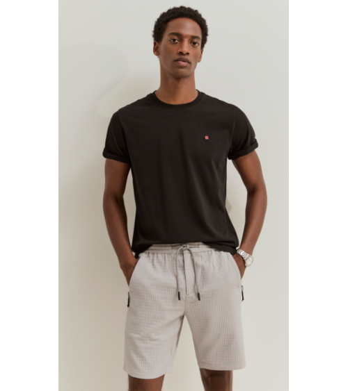 Pantalones cortos de corte regular fit, confeccionados en un tejido ligero con textura técnica en relieve. Presentan cintura elástica ajustable con cordón, dos bolsillos laterales y bolsillo trasero con cierre de cremallera, garantizando funcionalidad y comodidad en el día a día.