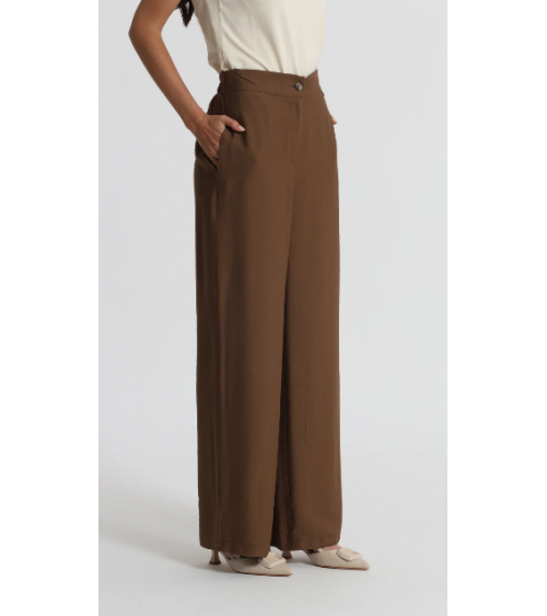 Pantalón de color marrón chocolate largo de pierna recta. Cintura con cierre de botón y cremallera con trasero elástico. Cuenta con bolsillos laterales biselados.