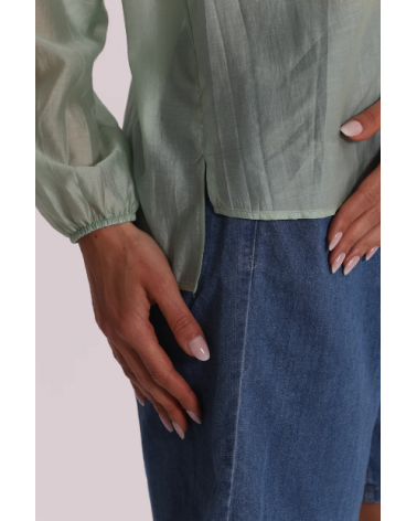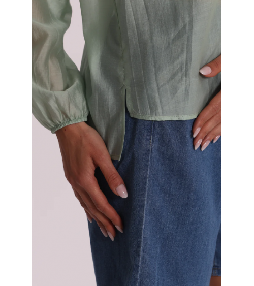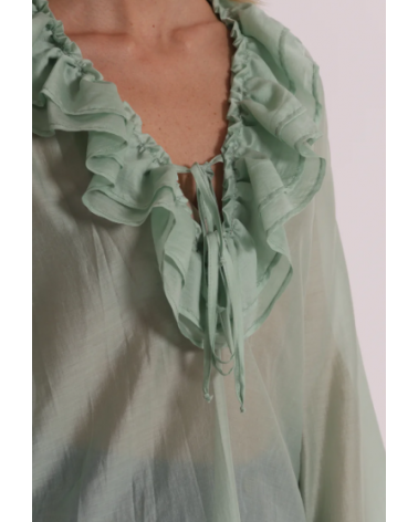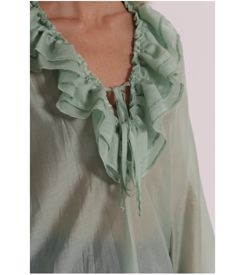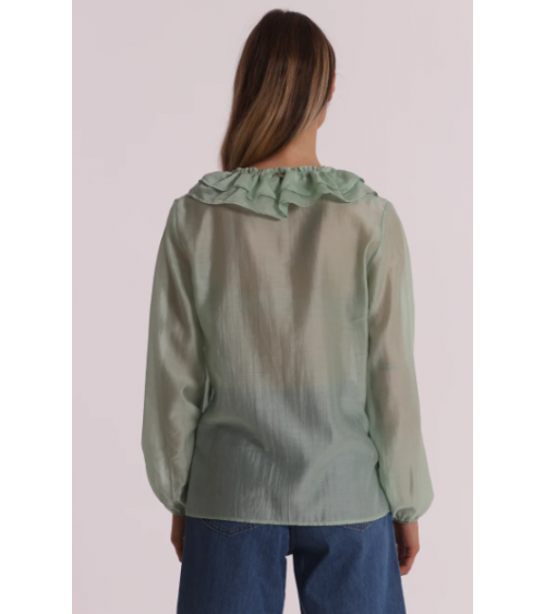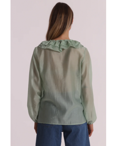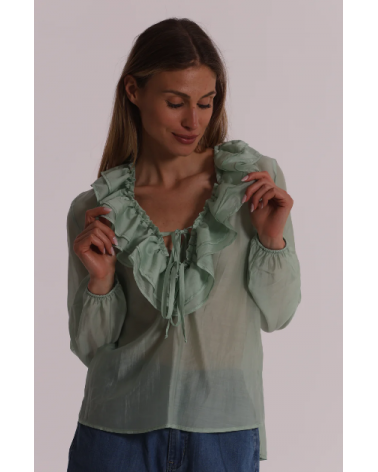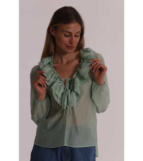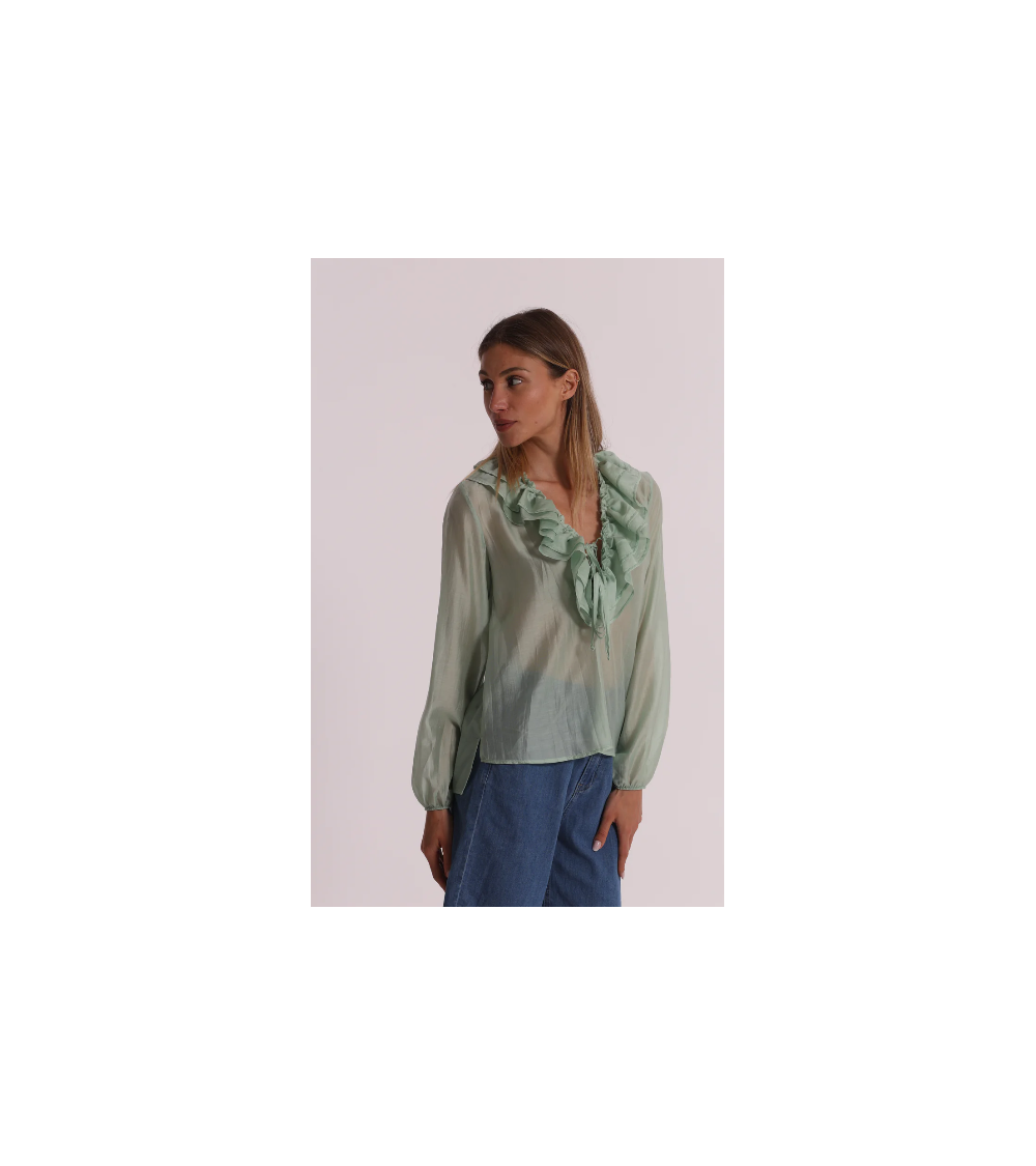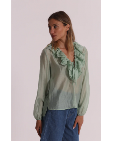 Blusa de gasa semitransparente en color verde agua con mangas largas y escote pico con volantes.