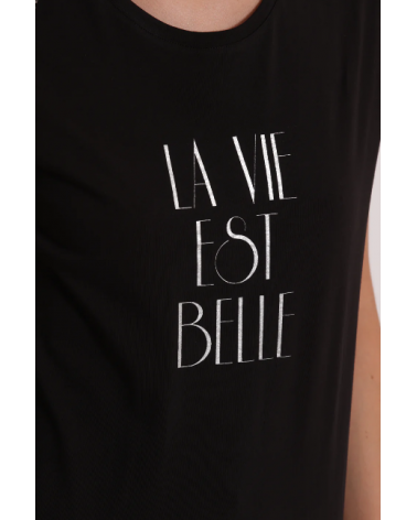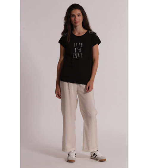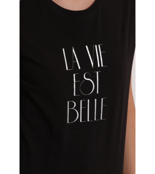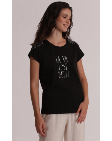 Camiseta negra de manga corta con detalles plata en los hombros. Frase "La vie est belle" en el pecho.