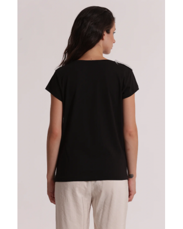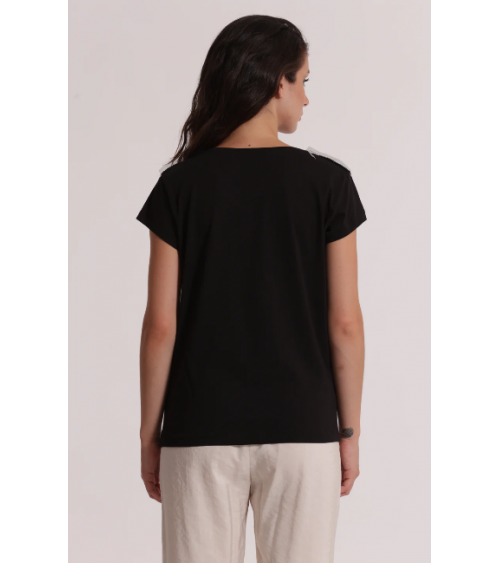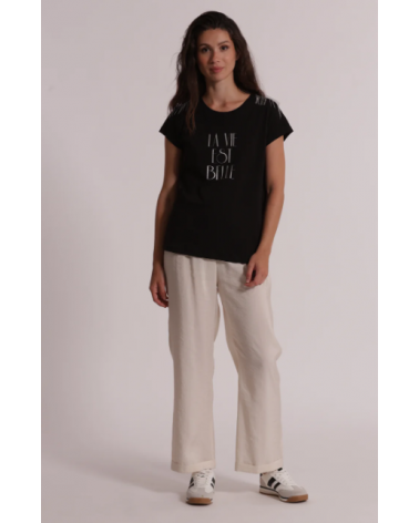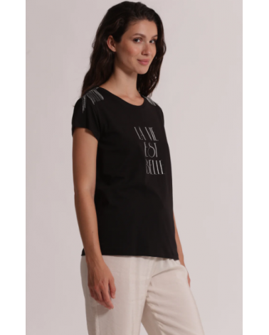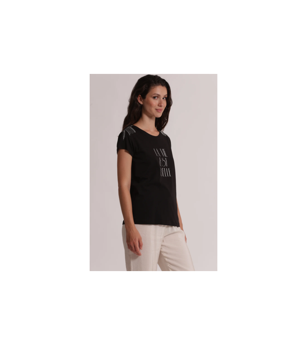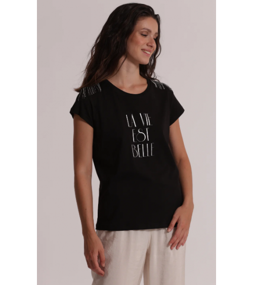 Camiseta negra manga corta detalles plata "La vie est belle" MIMI-MUA
