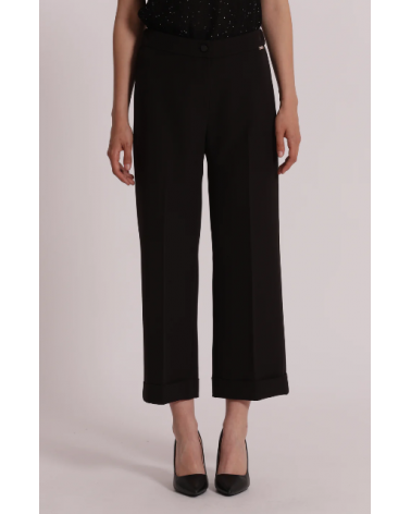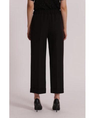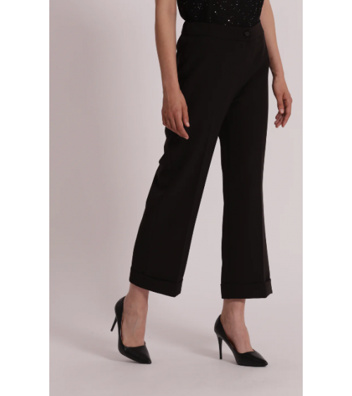 Pantalón negro crop con vuelta. Cierre con botón y cremallera y elástico trasero.