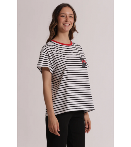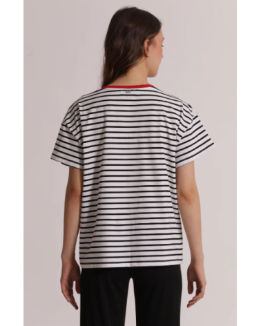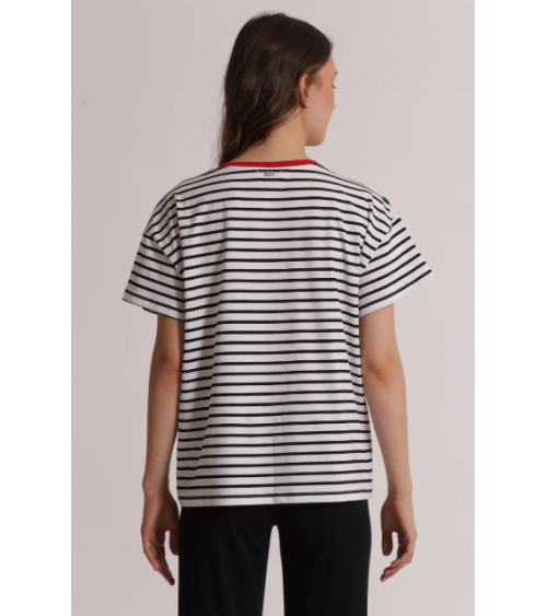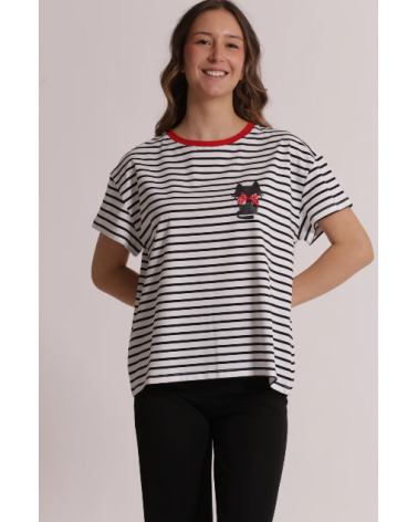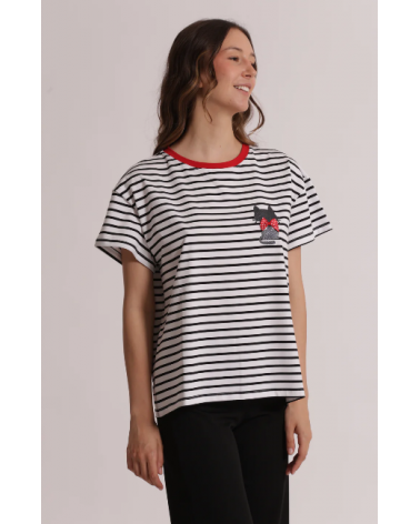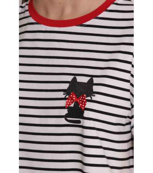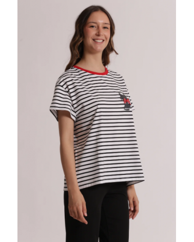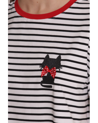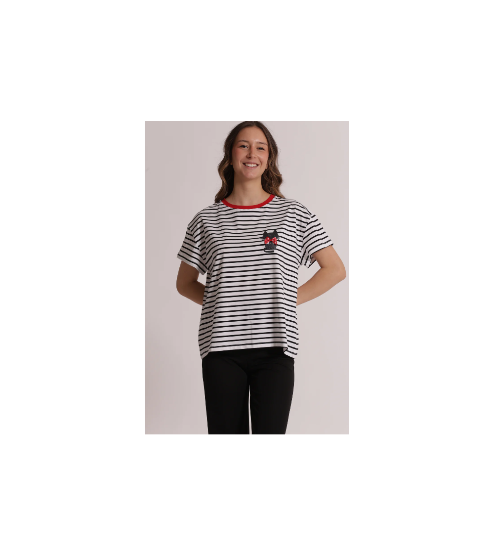 Camiseta rayas negro/blanco ribete contraste rojo manga corta gato MIMI-MUA