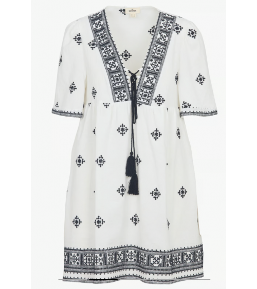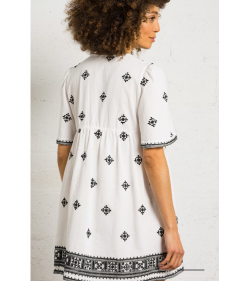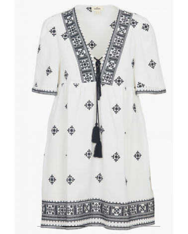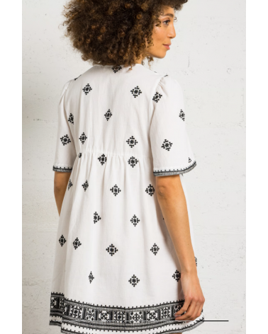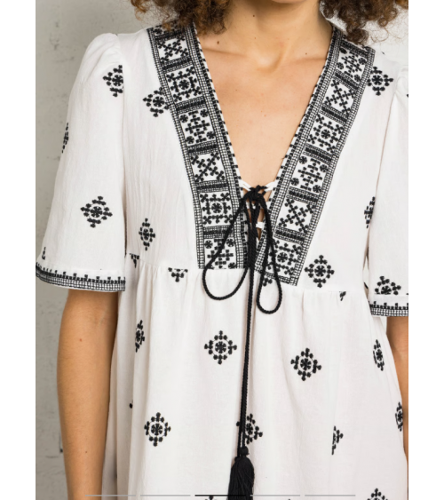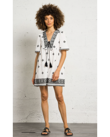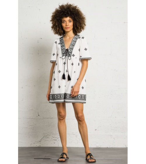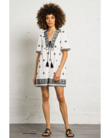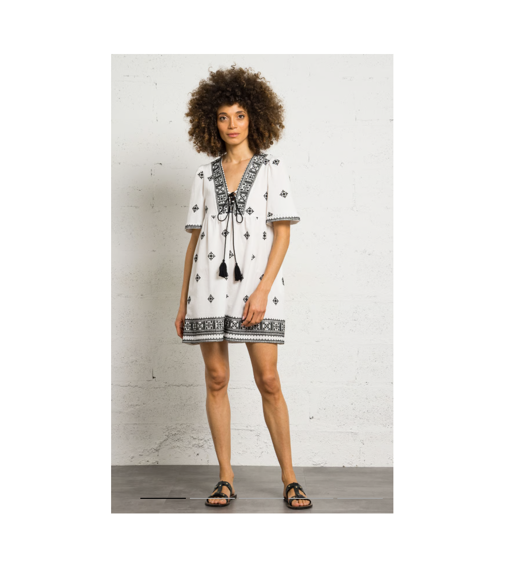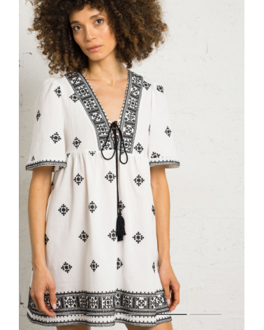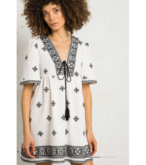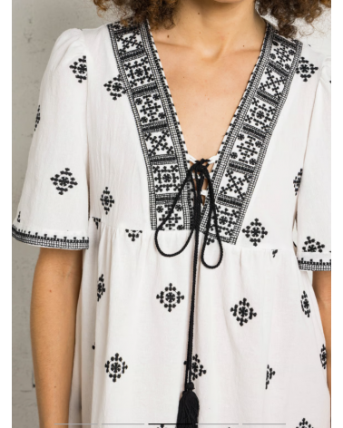 Vestido corto de algodón bordado con cuello de pico y corte recto. Mangas cortas, cintas para atar en el escote con pompones. Detalles de bordados en la parte superior.