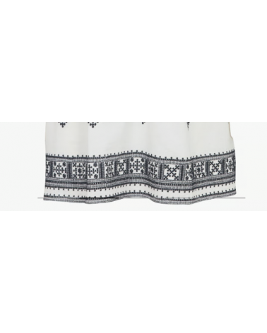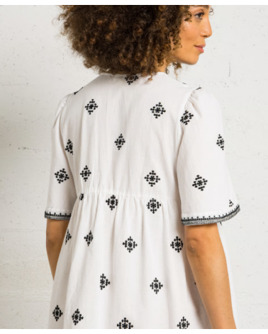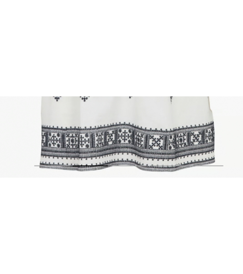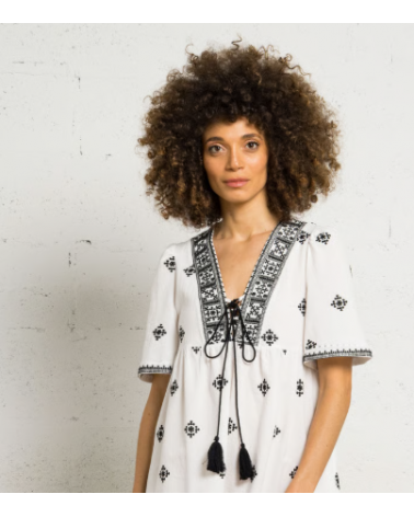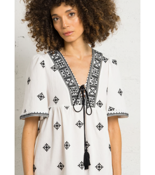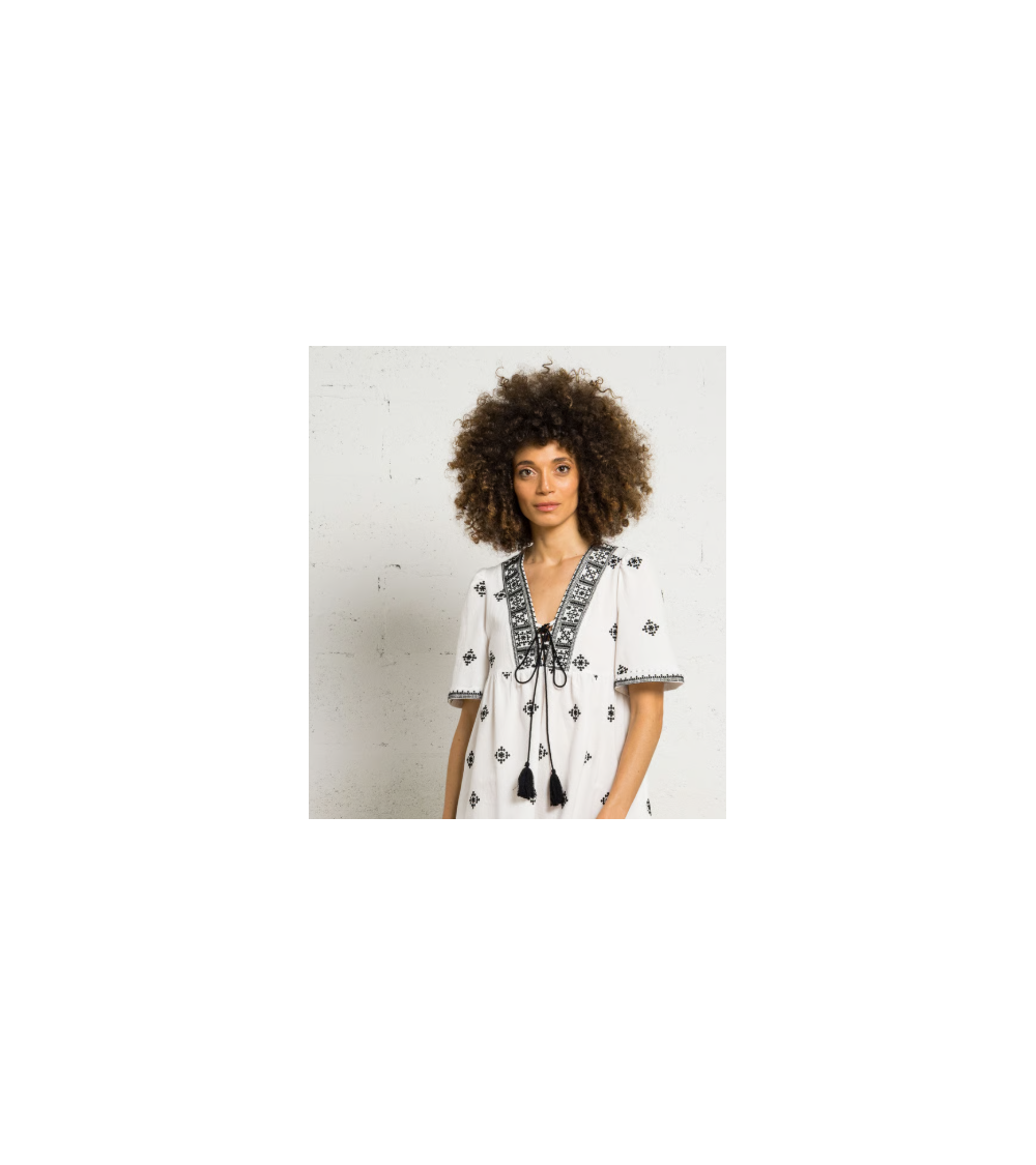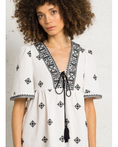 Blusa blanca de algodón bordado con cuello de pico y corte recto. Mangas cortas, cintas para atar en el escote con pompones. Detalles de bordados en la parte inferior.