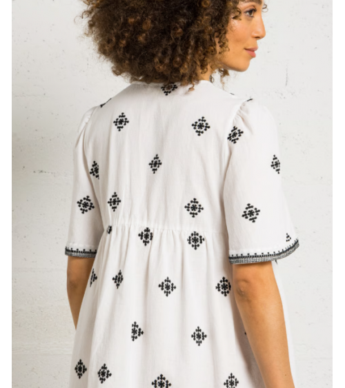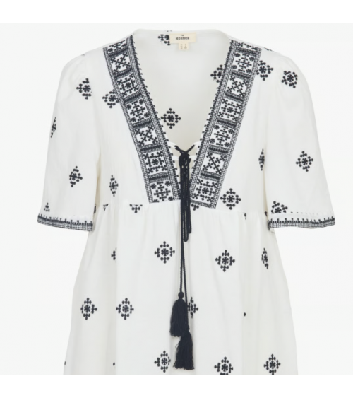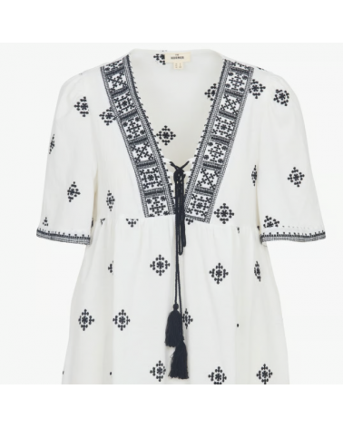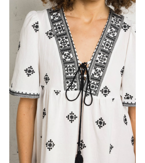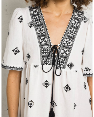 Blusa blanca bordado negro cuello pico manga corta cintas escote THE KORNER