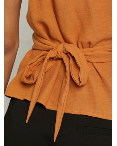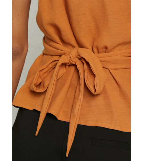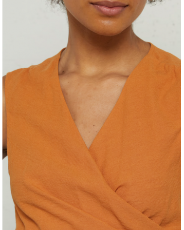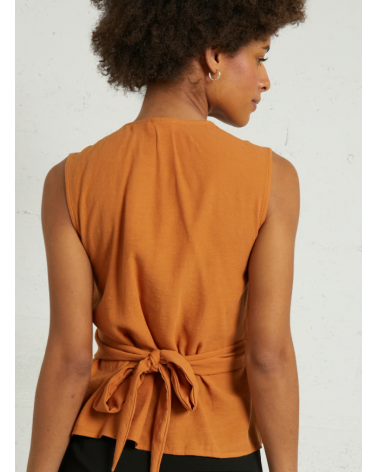 Top en color ocre con escote en V. Corte recto, sin mangas. Lazos para atar cruzado al frente.
