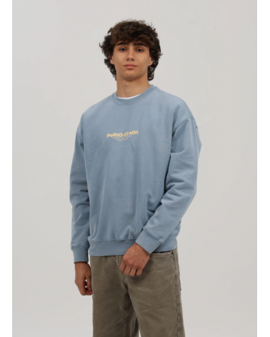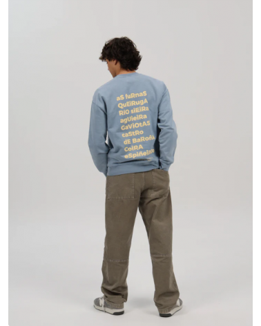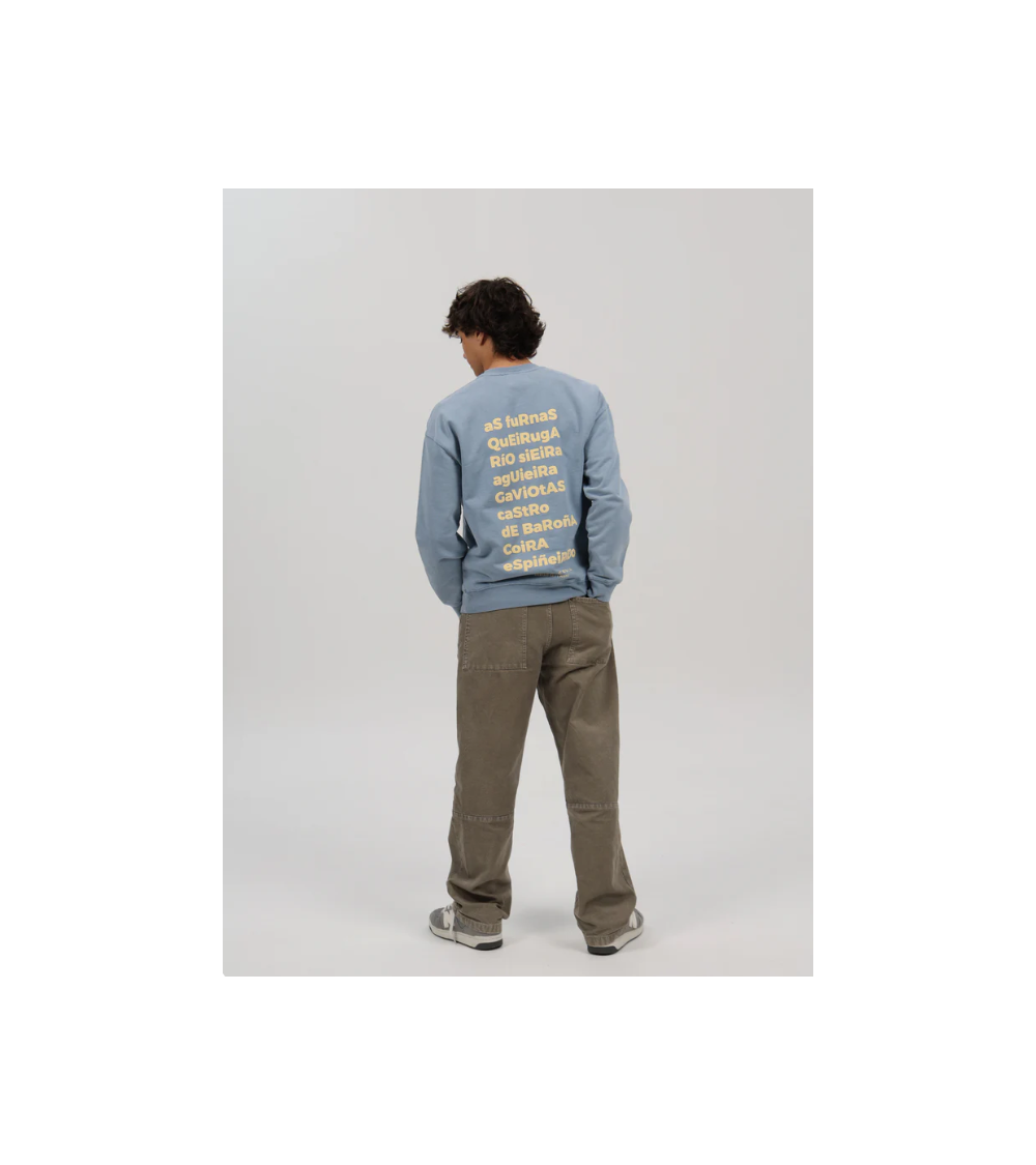 Sudadera azul lavado con letras de playas en la espalda de Porto do Son.