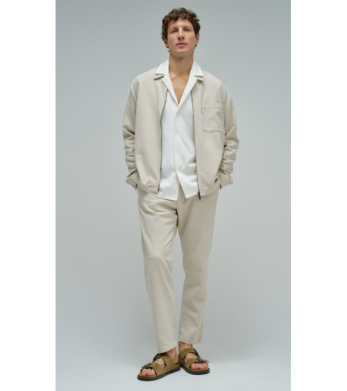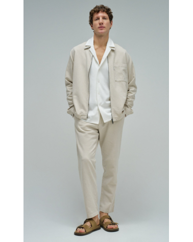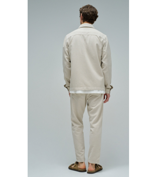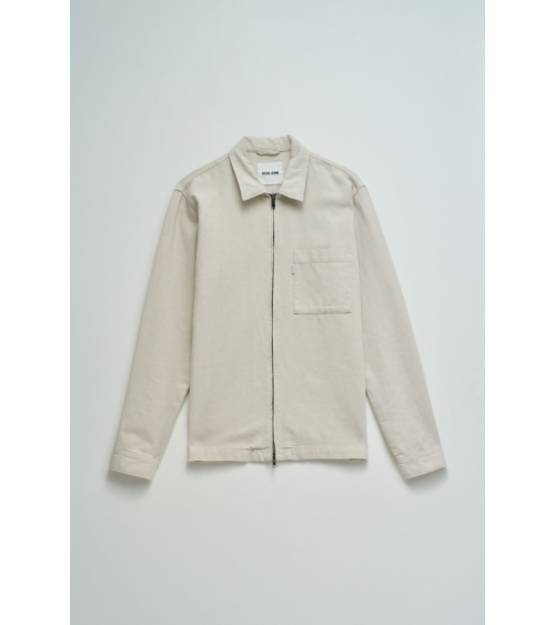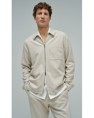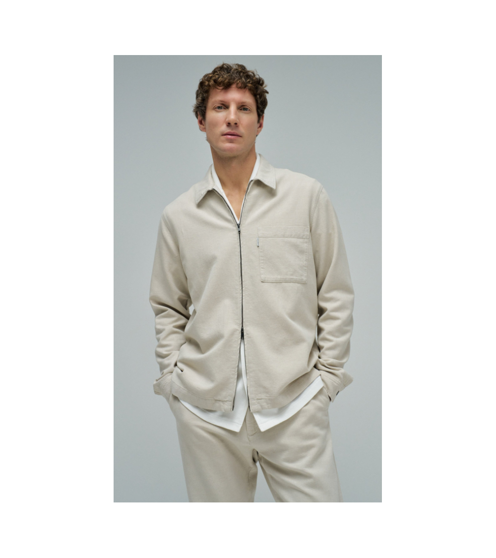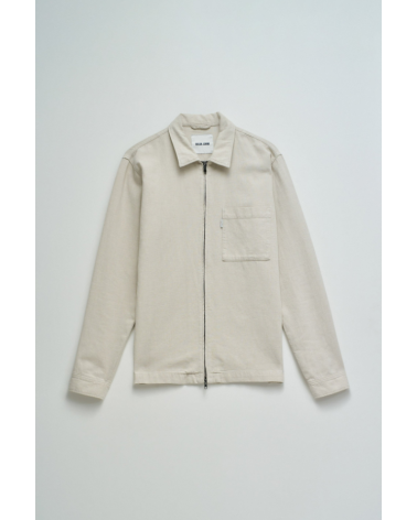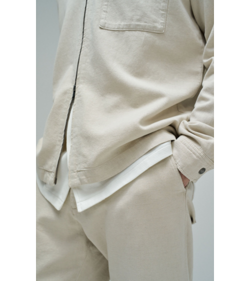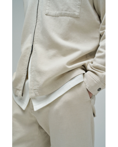 Sobrecamisa de lino de color crudo. El modelo cuenta con mangas largas con puños abotonados, escote con cuello clásico y apertura frontal con cremallera. Incluye un bolsillo en el pecho.