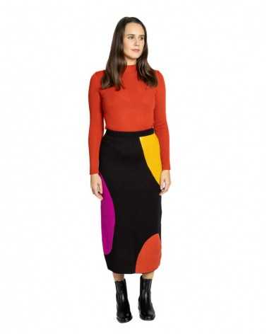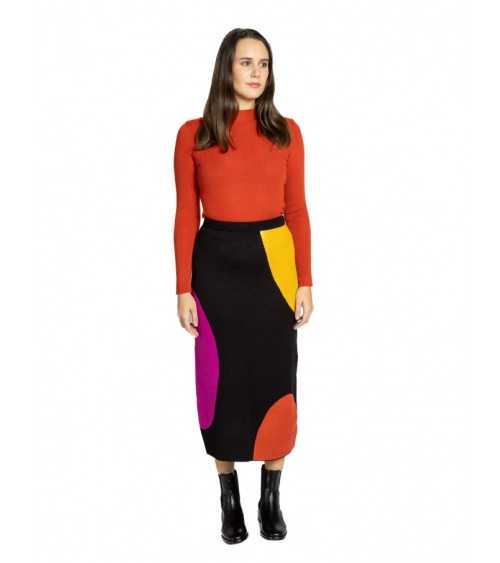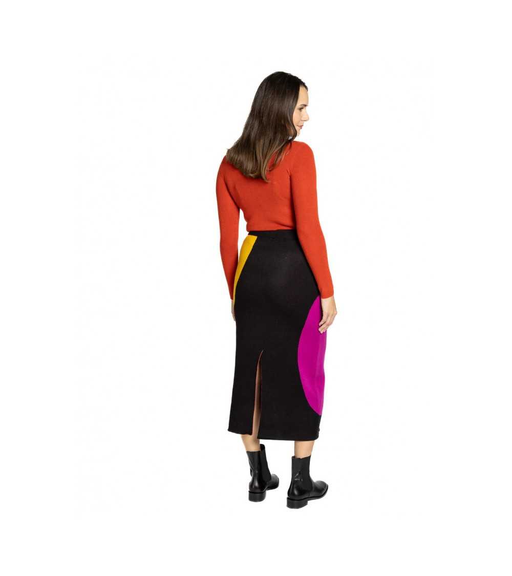 La falda es de la marca Compañía Fantástica. Color negro, estampado de maxi lunares de colores.