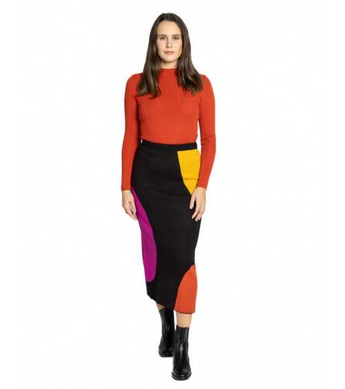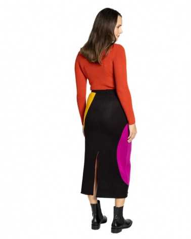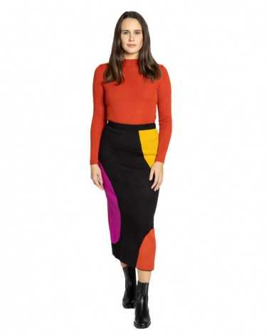 Talle alto con cinturilla elástica. Corte recto. Larga. Abertura trasera.