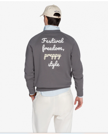 Destaca por su mensaje gráfico en la espalda, reflejando el espíritu preppy y desenfadado.