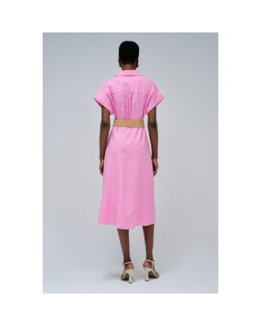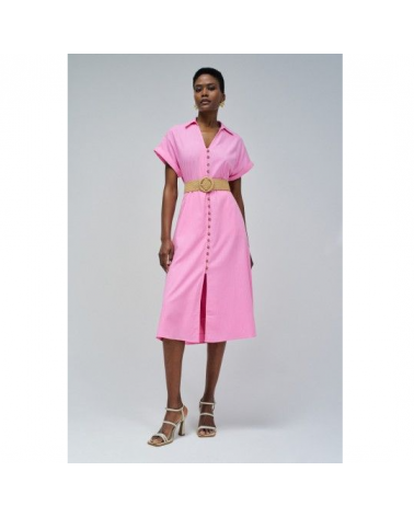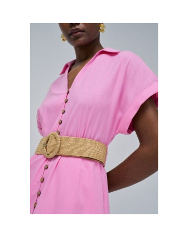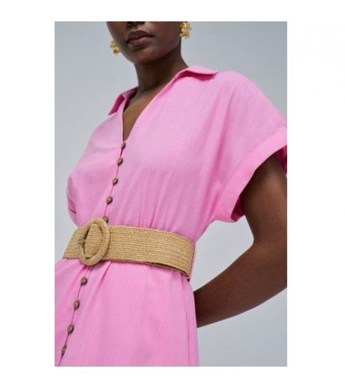 Vestido camisero rosa fuxia con cuello y abotonado con cinturon de rafia Salsajeans.