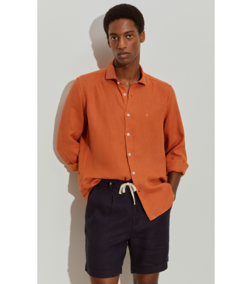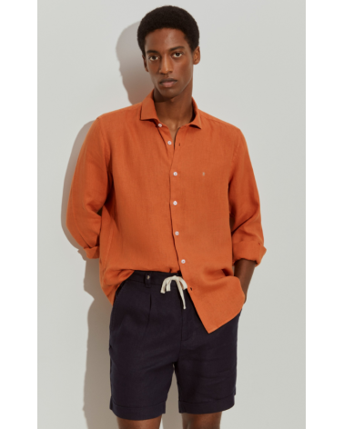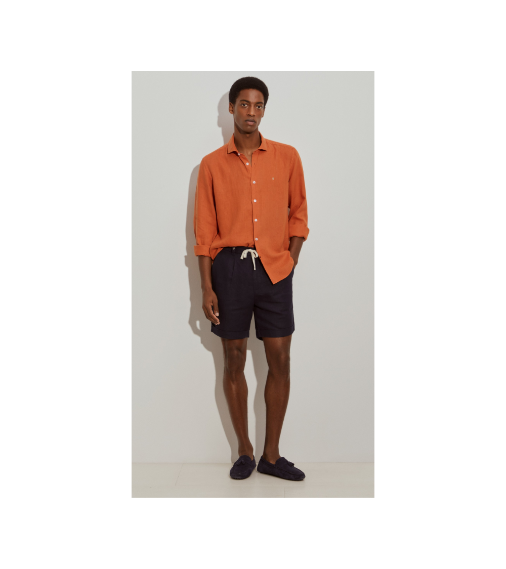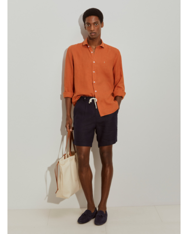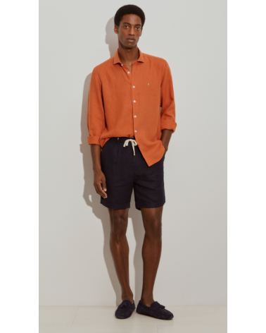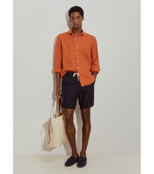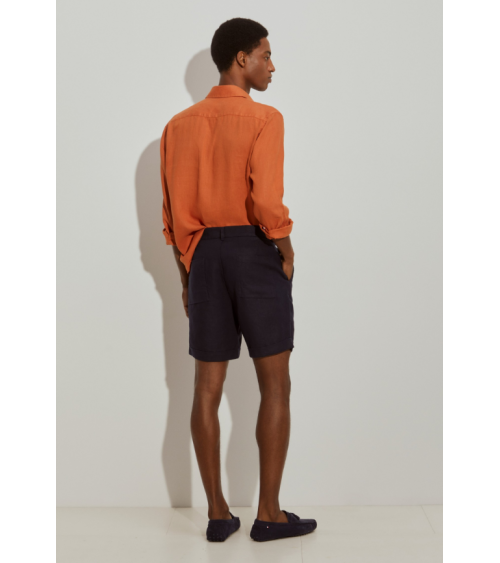 Bermudas con cintura elástica en espalda y cordón en contraste de color. Además se abrochan con cremallera y botón. Terminan con bolsillos laterales y traseros. Están confeccionados íntegramente en lino, lo que aporta a la pieza mayor ligereza, transpirabilidad y durabilidad.