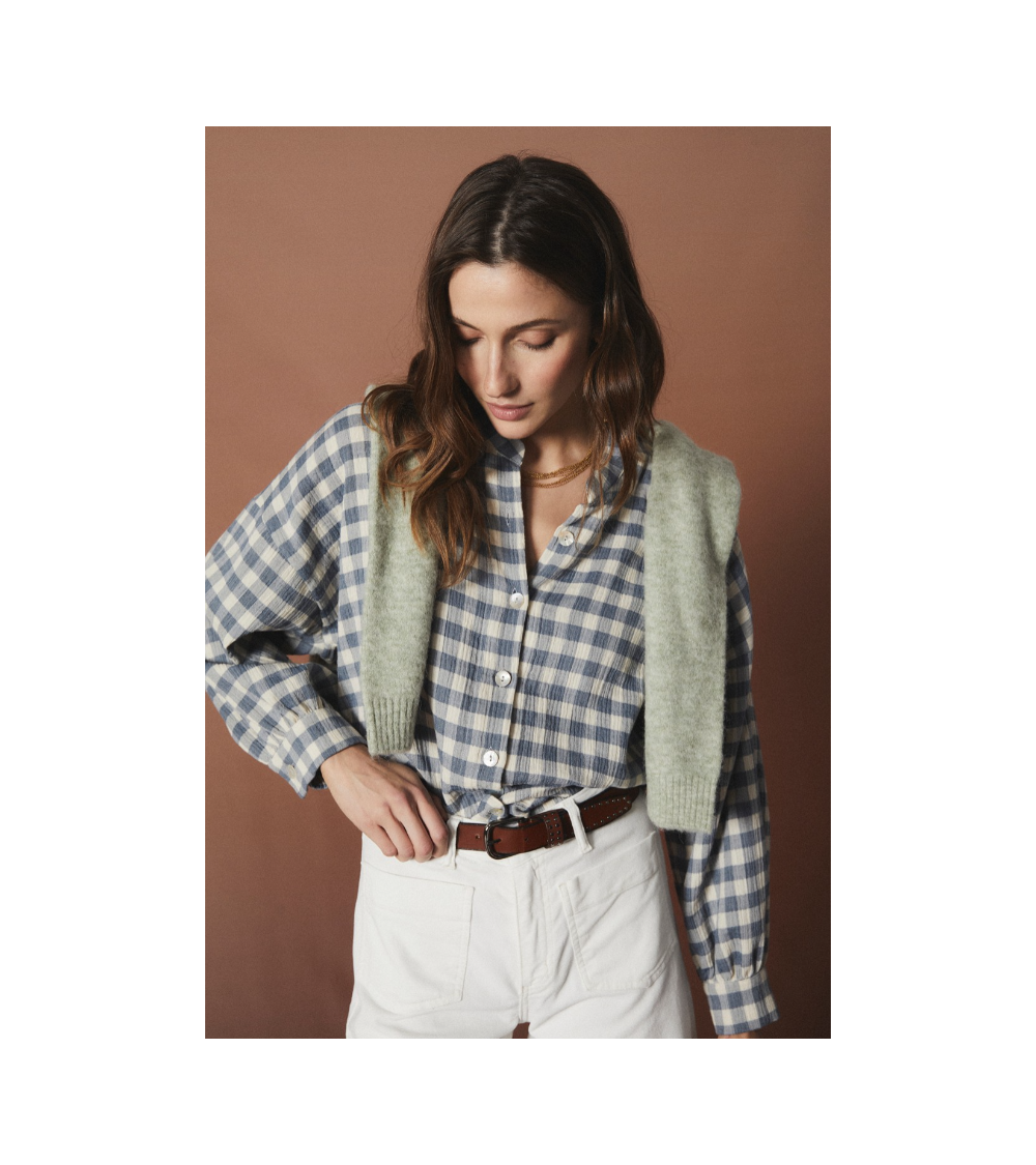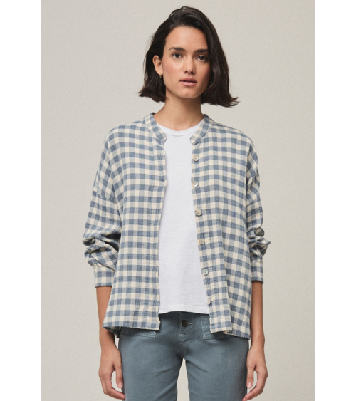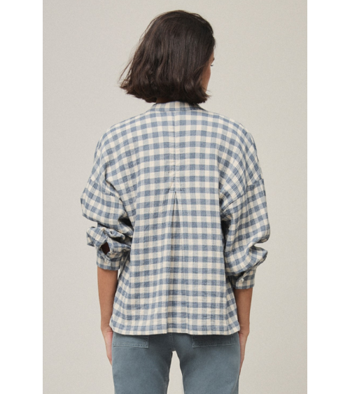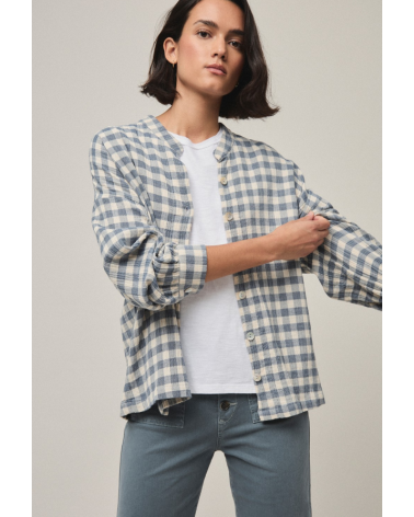 Camisa de cuadritos. Cuello mao, abotonadura centra con botones de nácar, manga larga con puño fruncido. Espalda con detalle de pliegue para dar volumen a la prenda. Confeccionada en un tejido rústico MI&CO
